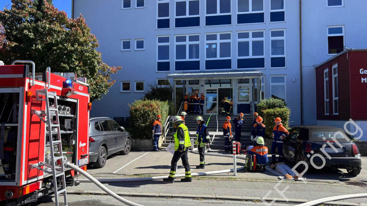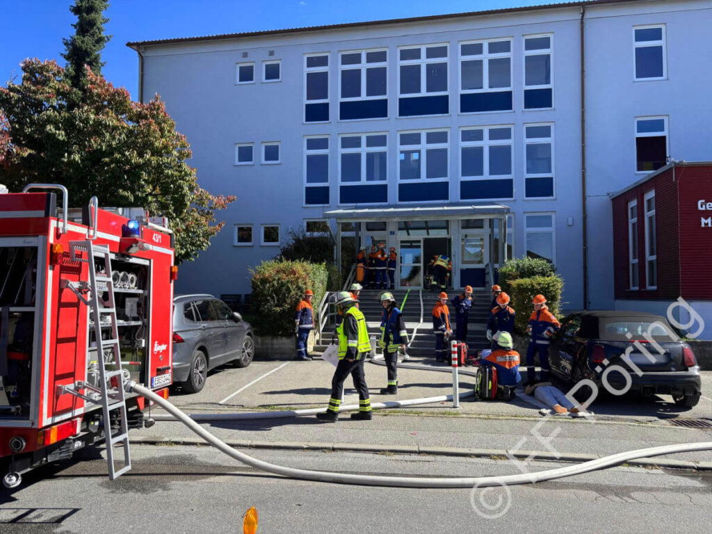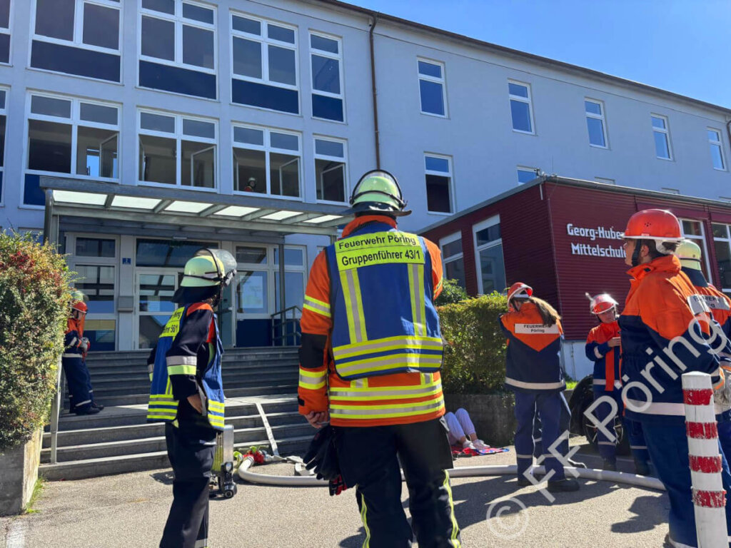 eine ausgelöste Brandmeldeanlage in einer Schule. Vor Ort war eine Rauchentwicklung zu beobachten, zudem wurden insgesamt 11 Personen vermisst. Ein Pöringer Trupp wurde deshalb zur Personensuche