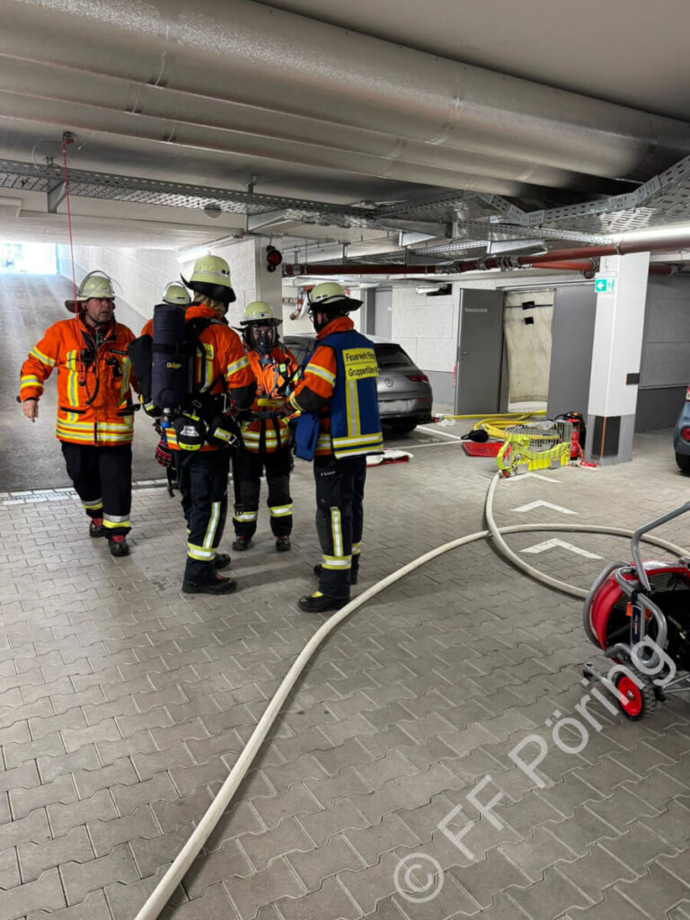 Wir wurden zu einer ausgelösten Brandmeldeanlage einer Wohnanlage mit Tiefgarage und sechs Gebäuden alarmiert. Die Anlage zeigte drei ausgelöste Brandmelder im Heizungsbereich an. Daraufhin ging ein Atemschutztrupp zur Erkundung in Richtung Heizung vor. Der Rest der Mannschaft aus dem HLF begann mit dem Aufbau der Löschwasserversorgung und stellte einen Löschangriff über die Zufahrt der Tiefgarage in Richtung Heizung her. Auch ein Lüfter mit entsprechender Stromversorgung wurde in Richtung Heizung in Stellung gebracht. Der Heizungsraum wurde vor Zutritt mit einem Rauchvorhang gesichert, um ein Ausbreiten von Brandgasen zu verhindern. Das LF8 wurde direkt zur Ausfahrt der Tiefgarage beordert, da dort auch der Zugang zur Heizung lag. Auftrag war hier die weitere Absicherung und die Belüftung des direkt über der Heizung befindlichen Gebäudes.